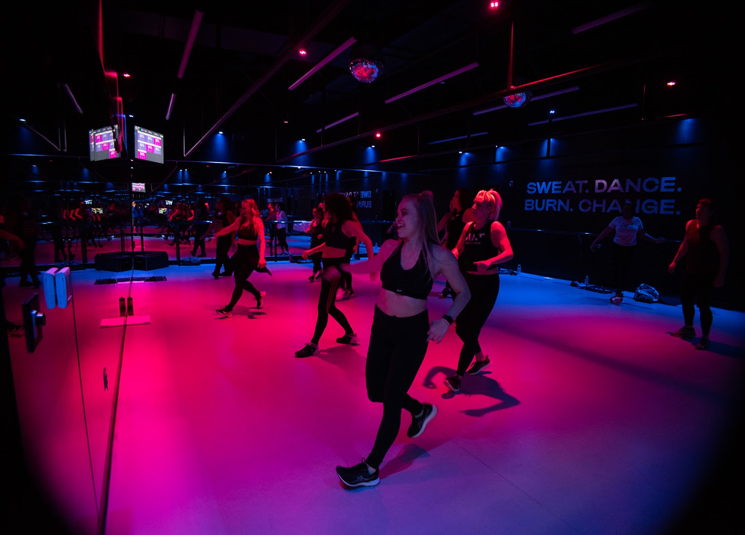 πΆ Party Vibe: Colored lighting and disco balls create an energetic, club-like atmosphere during workouts.