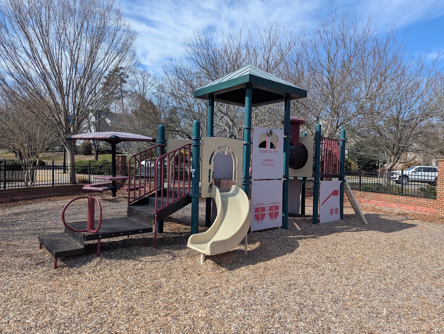 Oakboro Park is a well-maintained neighborhood park featuring a fenced playground area designed for young children, picnic tables, slides, and swings. The park's open design allows parents to keep an eye on their kids easily while enjoying peaceful green spaces.
